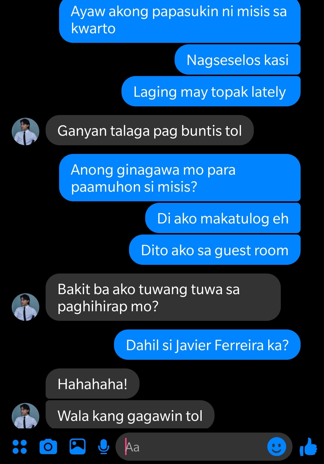 Siya na ang bahala nun. Yung sabihin sa kasama di ka gusto pero pagwalang tao saka lalapit sayo at kung anong pagpapansin ang gagawin lalambingin ka tapos aasarin. Magagalit ka sa kanya lalo sa sarili mo kung bakit hindi sumasang-ayon lahat sa nais mo.